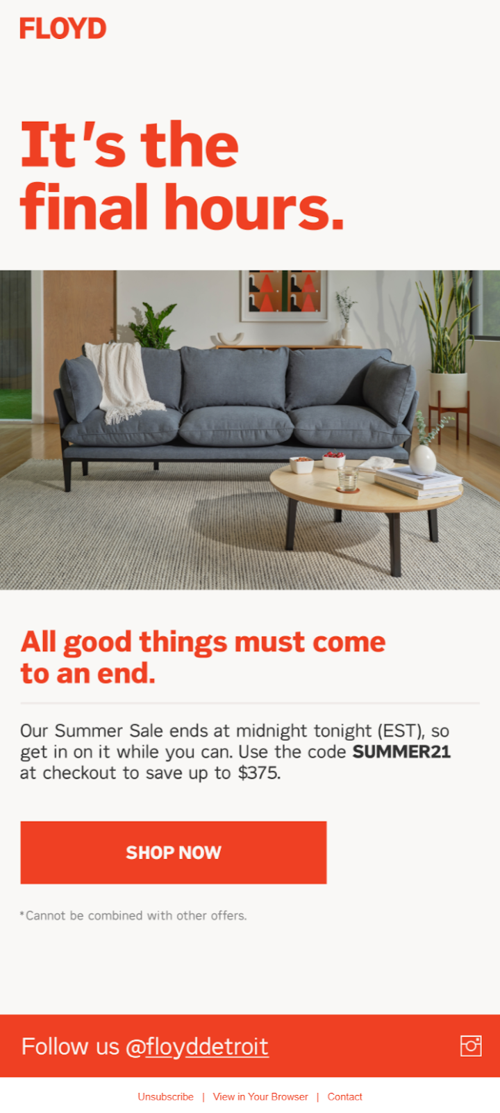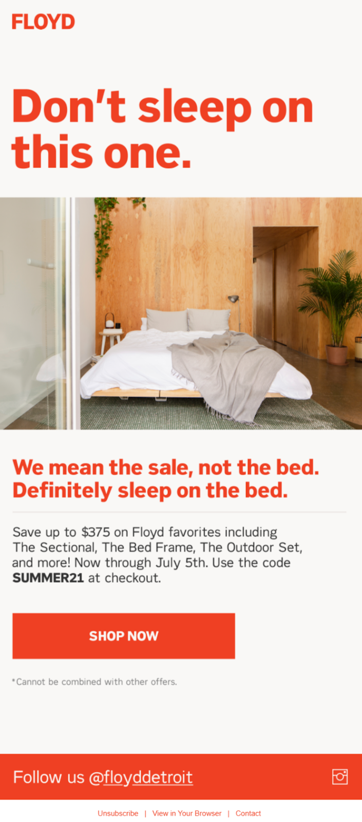 The DTC furniture brand Floyd plays with different messages, images, and copy, while keeping the email short and simple, with a clear call-to-action: “Shop now.”