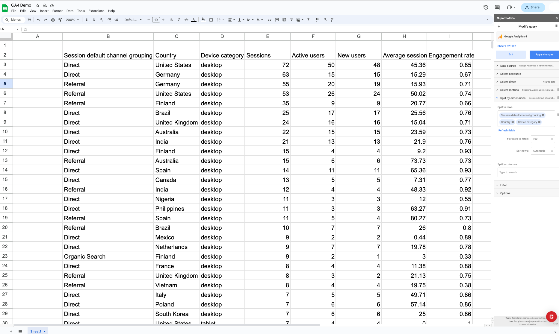 With Supermetrics, you can easily get GA4 data into your favorite reporting tools. This gives you more flexibility to build custom reports and get the insights you need. For example, you can combine GA4 data with other marketing data in Google Sheets. From there, you can use different calculations and functions to analyze your data.