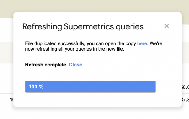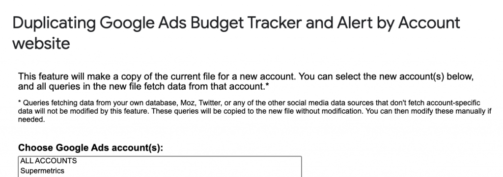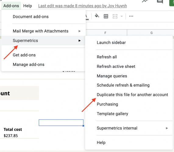 Next, open and duplicate this template . Click “Add-ons” → “Supermetrics” → “Duplicate this file for another account.”