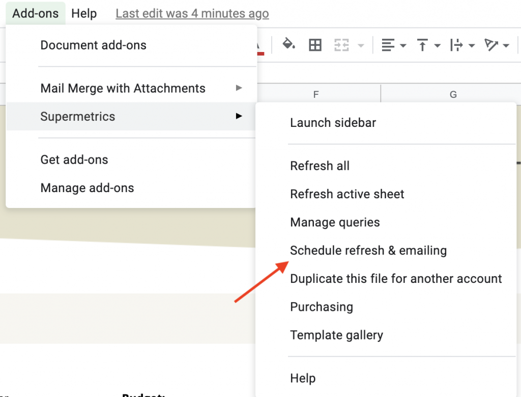 You can do this by going to “Add-ons” → “Supermetrics” → “Scheduled refresh & emailing.”