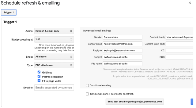 In case you want to pay attention when a particular account is overspending or underspending, you can use Supermetrics’ scheduled refresh and emailing settings to stay alert of any changes that may occur.
