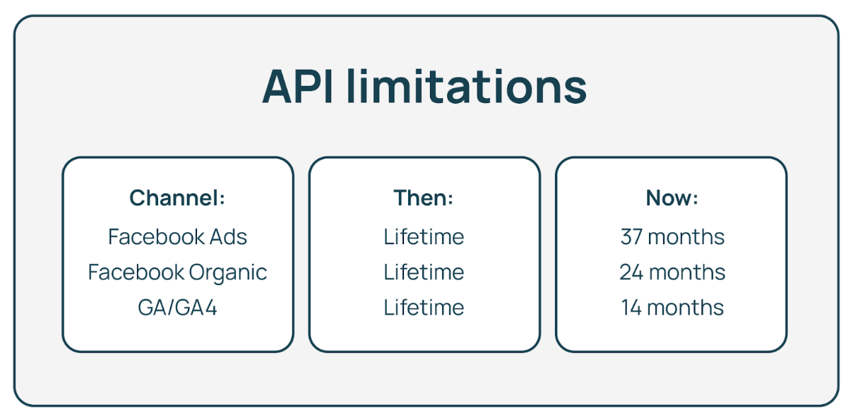 Advertising platforms keep changing how long they’ll keep your data. Instead of depending on their data retention policies, you should save all your data in a data warehouse. This way, you have a better chance to do historical analysis.