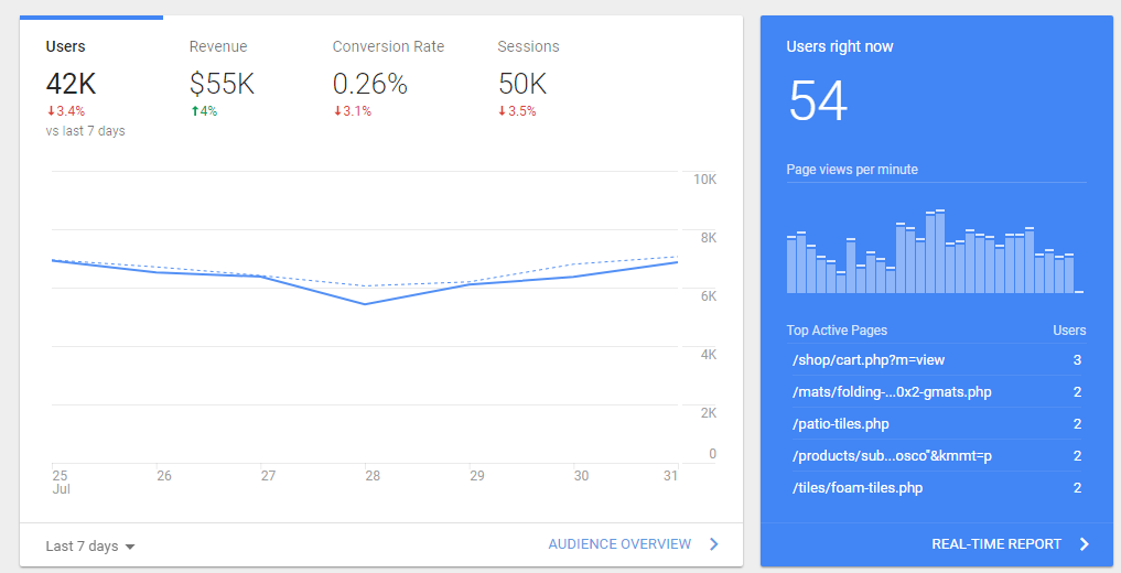 The card on the right gives you the number of users in the last 30 minutes. You can see more real-time data if you click the View real-time button on the bottom right.