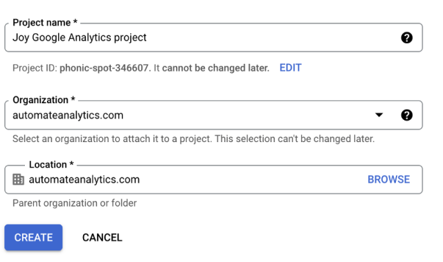 Fill in your project name, organization, and location. Then click ‘Create’.