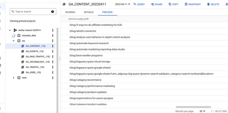 For example, if you want to see your content data, click ‘GA_CONTENT_’. You’ll see the description of the schema. You can also see the preview of your data, such as page title, exit time, page load time, etc.