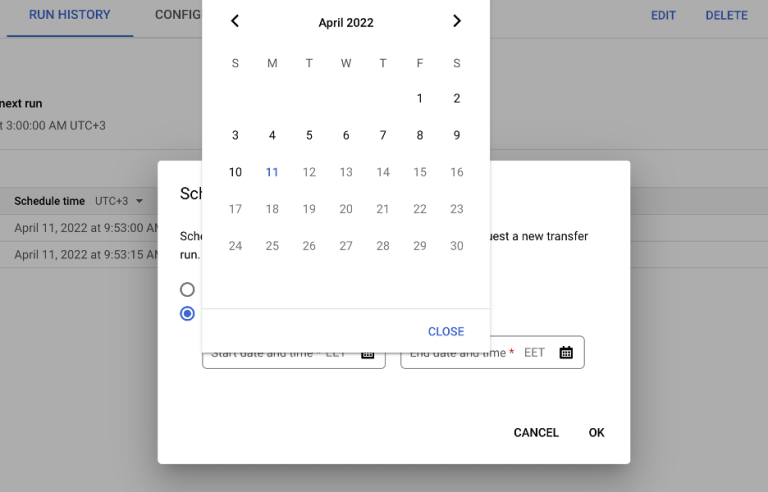 Then, click ’Save’. Click ‘Schedule backfill’ and choose ‘Run for a data range’ to schedule a backfill with this configuration.
