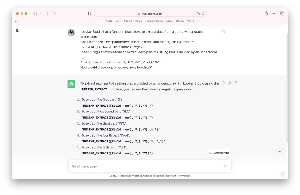 Below is an example of how we asked Chat GPT for help. While making your request, it’s important to mention you’re using Looker Studio because there are different types of regular expressions with different language variations.