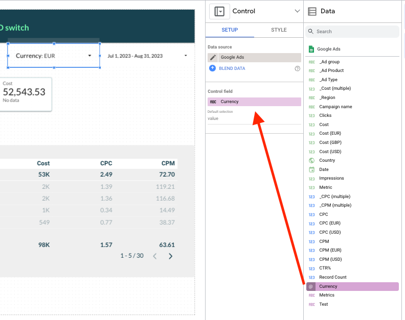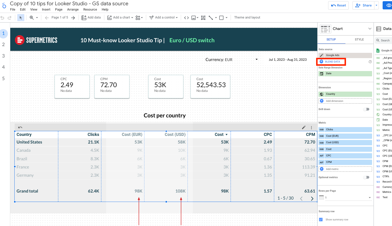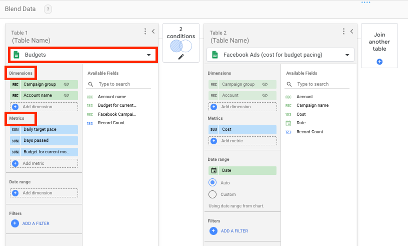 There are endless use cases for data blending, and it’s one of the most useful features in Looker Studio. Data blending can be used, for example, to measure the total spend across various channels for a specific campaign. With data blending, measuring total spend would be easier, as the field names vary between the sources. For example, on LinkedIn, spend is called “Total spent”. But, in Google Ads, it’s “Cost,” and on Facebook, it’s “Amount spent”. This makes it harder to merge data to create an overview of your performance.