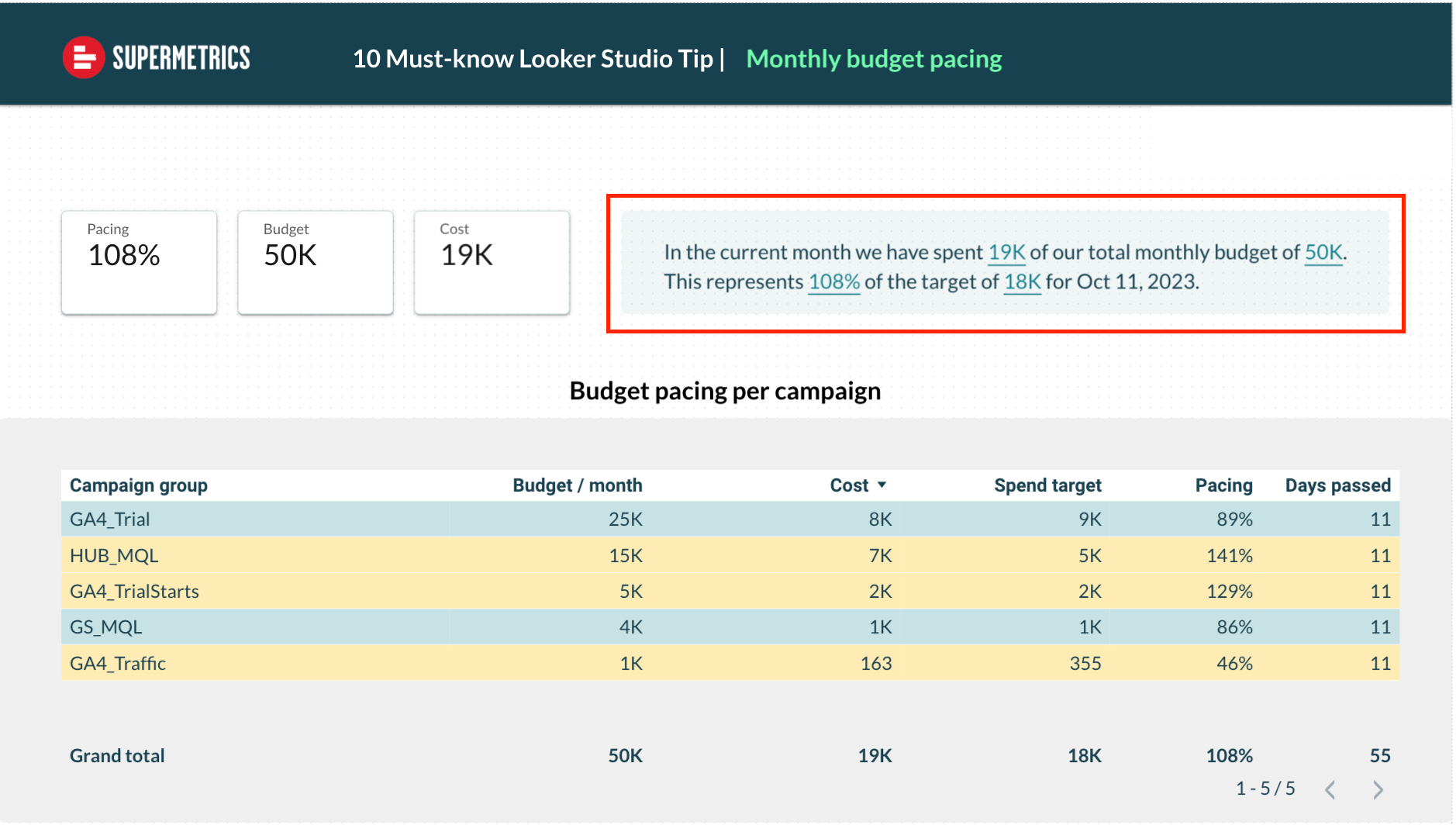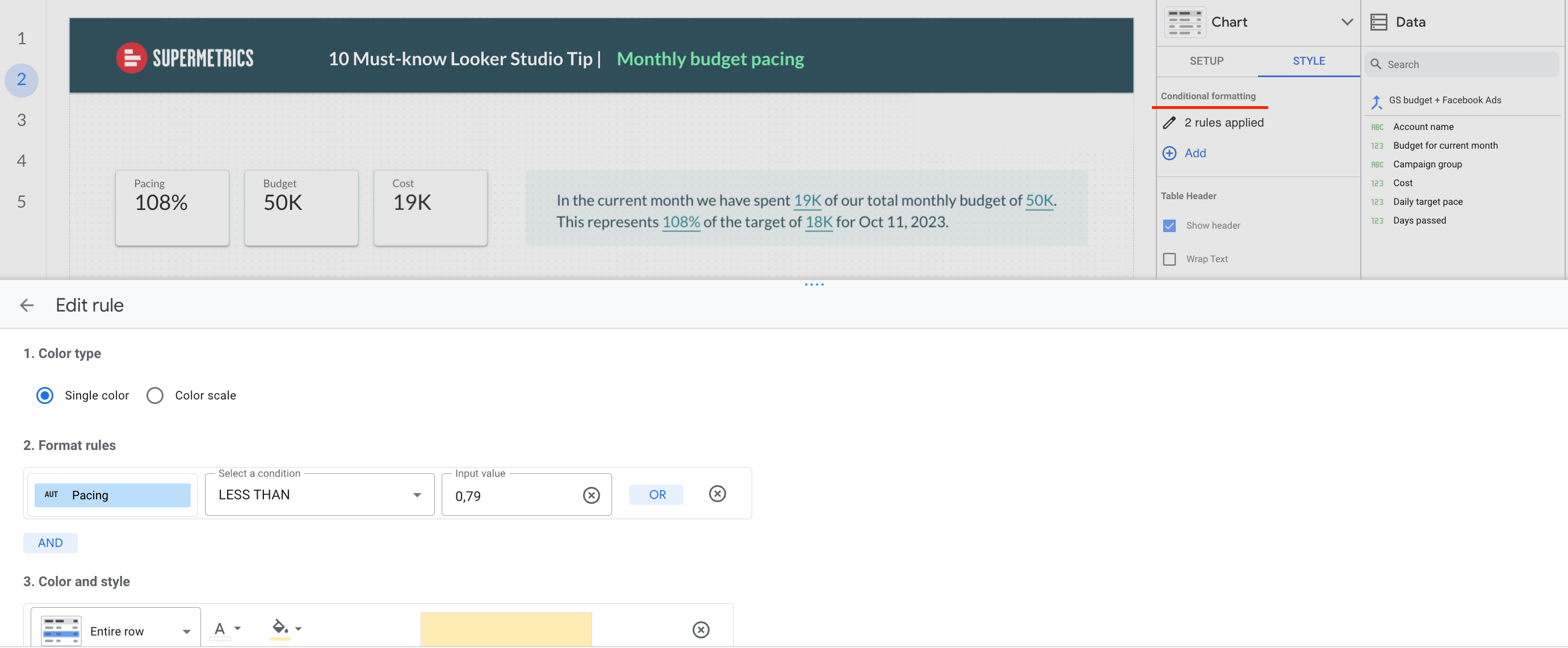 Conditional formatting is another easy tip, but it makes a huge difference on your dashboards. You can use conditional formatting in tables or scorecards. It lets you quickly spot outliers in your data by highlighting them with a specific color. One example use case is to highlight when you’re over or under-pacing your monthly budget.