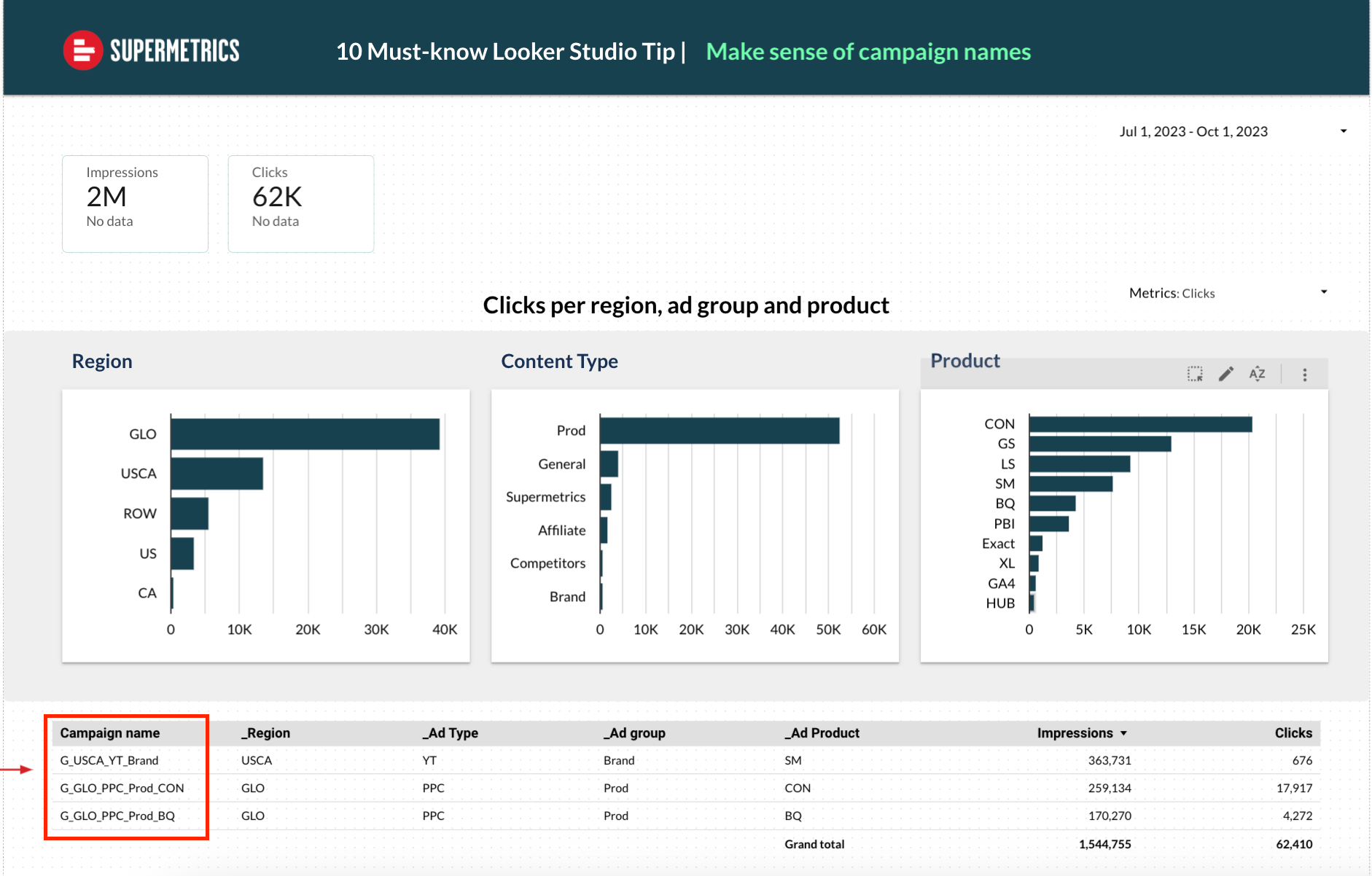 There are multiple use cases for regular expressions. We at Supermetrics have a unified naming convention for all our marketing campaigns. The campaign’s name can tell us many things, like the ad channel, region, content type, and product. By using RegEx, we can split the data with each of those pieces and capture them individually.