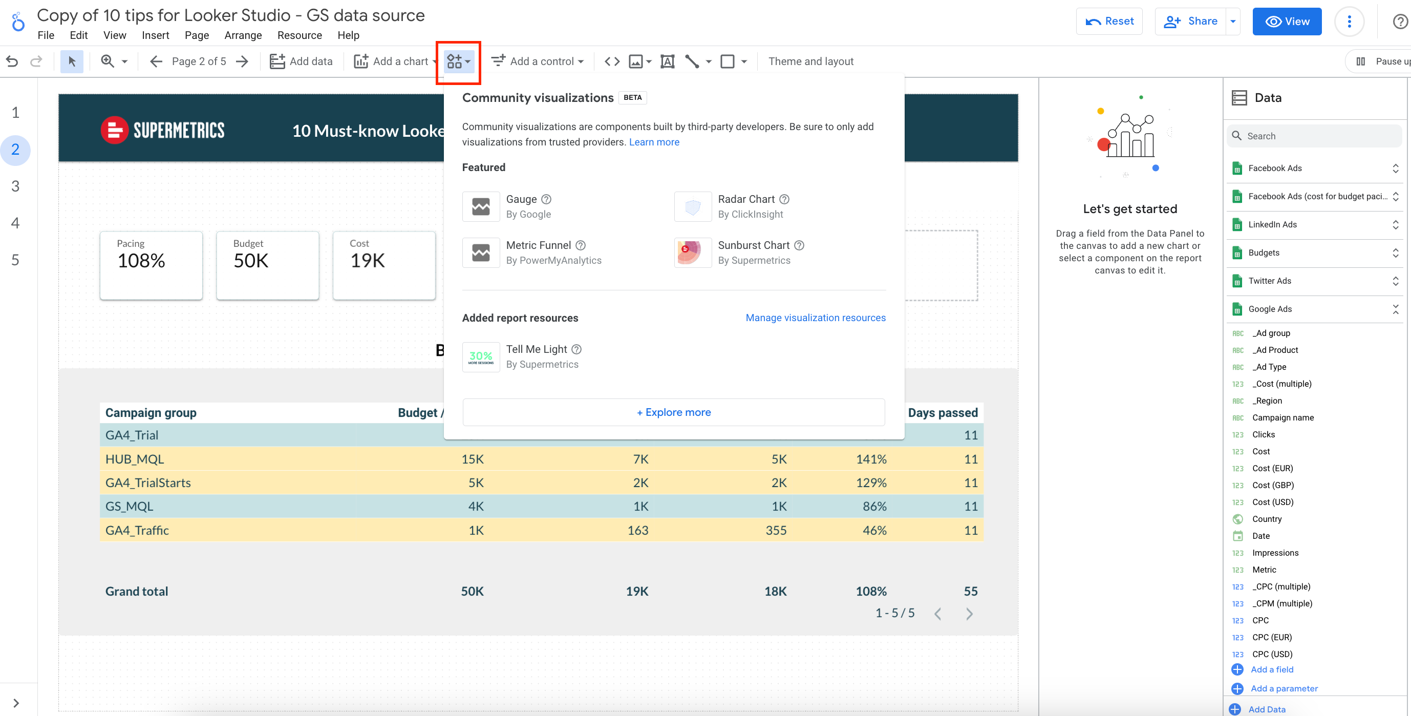 You can find the “Tell me” chart, as well as other Supermetrics charts, from the community visualizations tab and by clicking “Explore more”. Just select the “Tell me” chart and drag it to your dashboard.