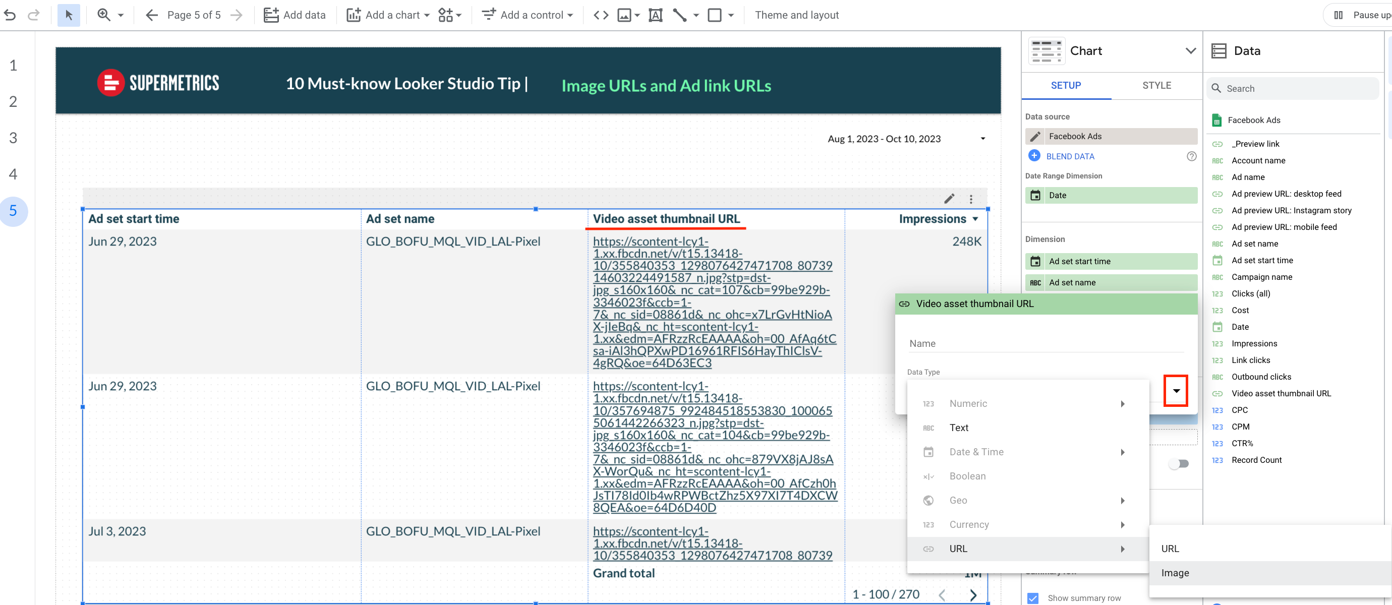 First, you need to add the video thumbnail URL to your dimensions. This will show it on your table. However, the URL format isn’t the most viewer-friendly, so let’s change it to show the actual image. Just click the pen icon, click the “Data type” drop-down, and change the type from “URL” to “Image”.