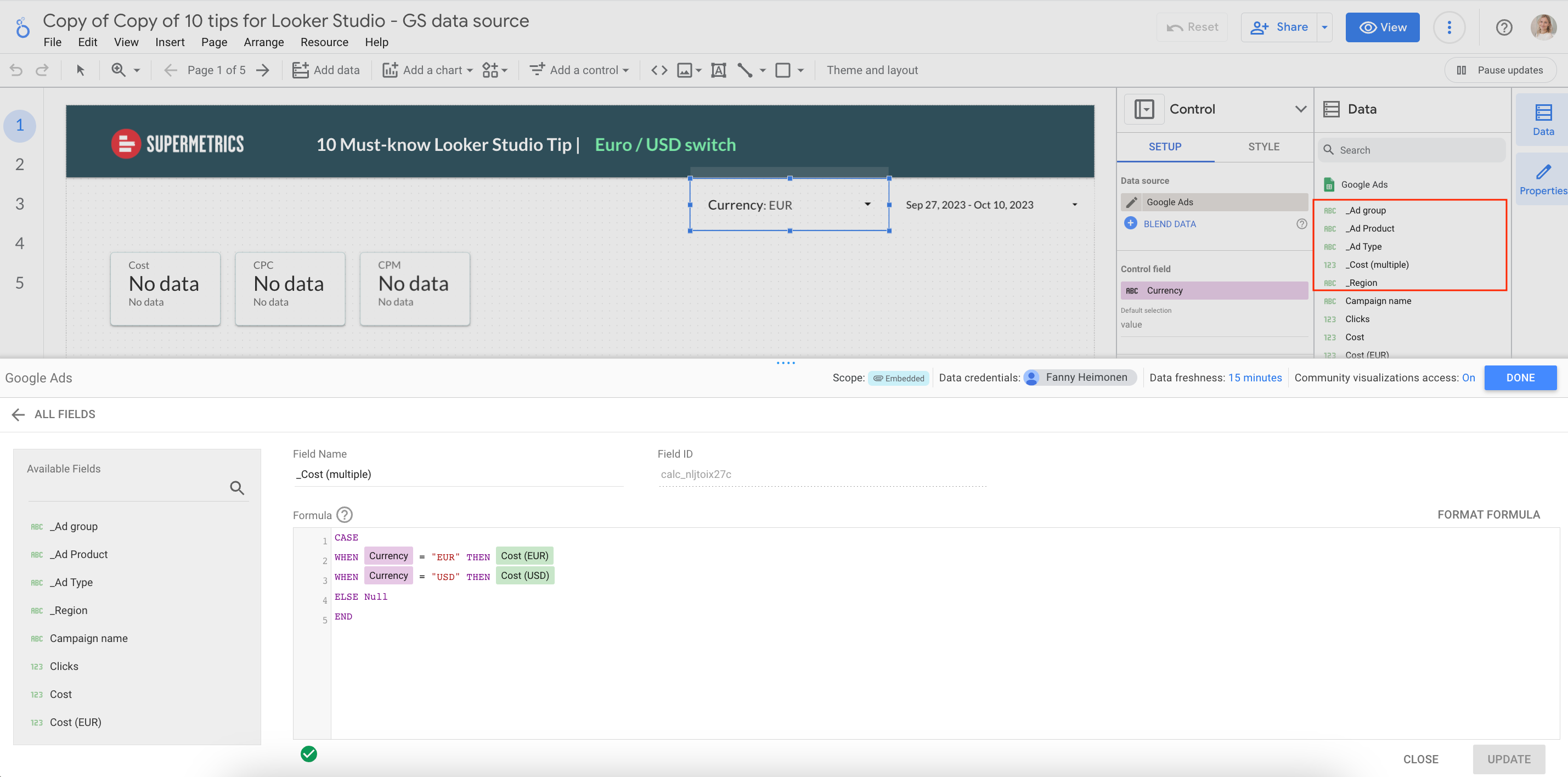 In the image below, you’ll see the formula for how we’ve created a calculated field for multiple costs. The parameter we just created—currency—is pink, and the new fields are green.