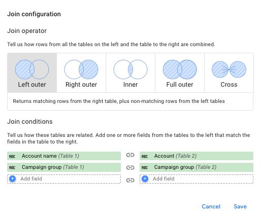 You can blend data in Looker Studio with 5 different join operators. The results vary depending on the join operator you pick.
