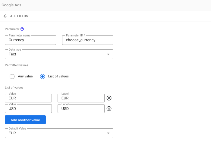 Using the currency control, you won’t need two separate columns for costs in EUR and USD. You’d have one column for the cost that changes according to the selection in the currency control. You can start creating the currency switch by creating a new parameter.