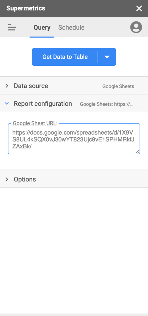 - Enter the URL for the sheet you want to import your data from in the “Report configuration” field.