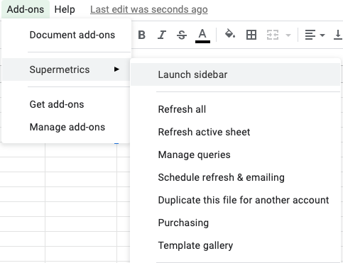 - Click on “Add-ons” ➡️ “Supermetrics” ➡️ “Launch sidebar”.