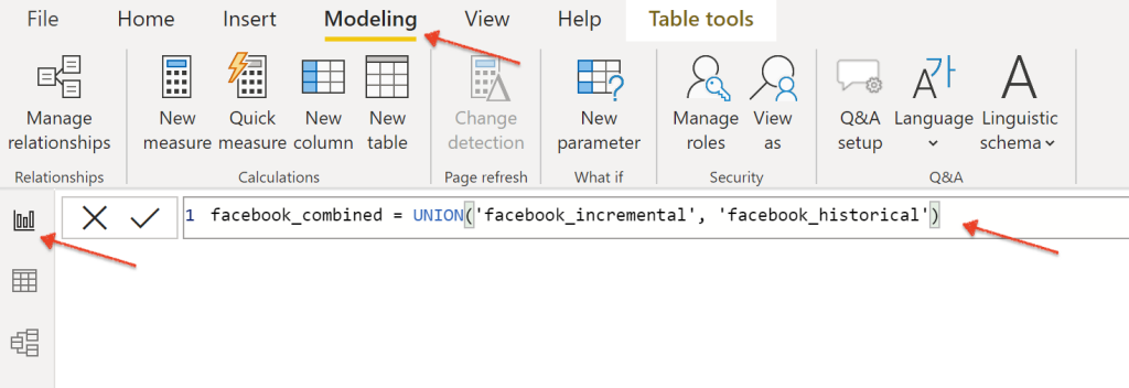 Now, we’re going to create a calculated table that merges our two tables as one. The (UNION) function in Power BI can take any number of tables and perform a SQL-style UNION on them. Basically, that means that with this single calculated table, you’re able to build visualizations based on the data contained in both “facebook_historical” and “facebook_incremental”.