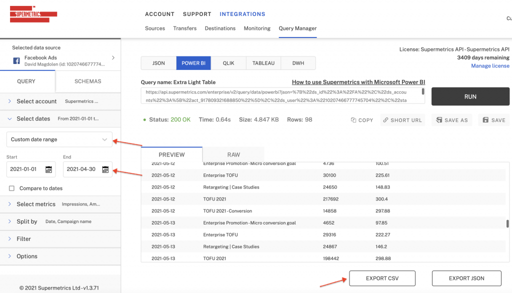 Supermetrics’ query manager is a great place for profiling your data before loading it into your BI tool, but it can also be used to export historical data from your marketing data sources. Simply run your query for the dates you’re interested in, and use the button at the bottom to export the results to a CSV.