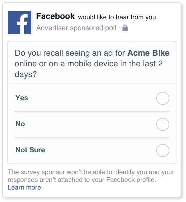 Ad recall : Brand recall has been used for a long time in marketing to evaluate whether your brand, product, ad is memorable. Facebook does this by looking at user behavior and polling. You might have been asked whether you remember a certain ad — like the example below. This information is used in the ad recall metrics. Follow this metric to see if your creatives are resonating with your audience.