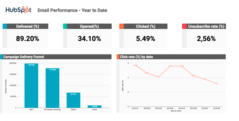 In order to run successful email campaigns, you have to constantly monitor their performance and develop effective optimization strategies. The HubSpot Email Performance template is perfect for this task: you will immediately see the key metrics (such as email opens and link clicks among others) together with campaign delivery data. Within the template you can jump to the following tabs to see more detailed numbers.