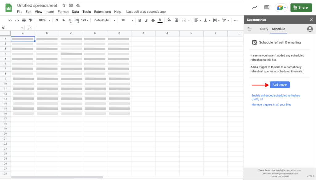 On the Supermetrics sidebar, click “Schedule” > “Add trigger”