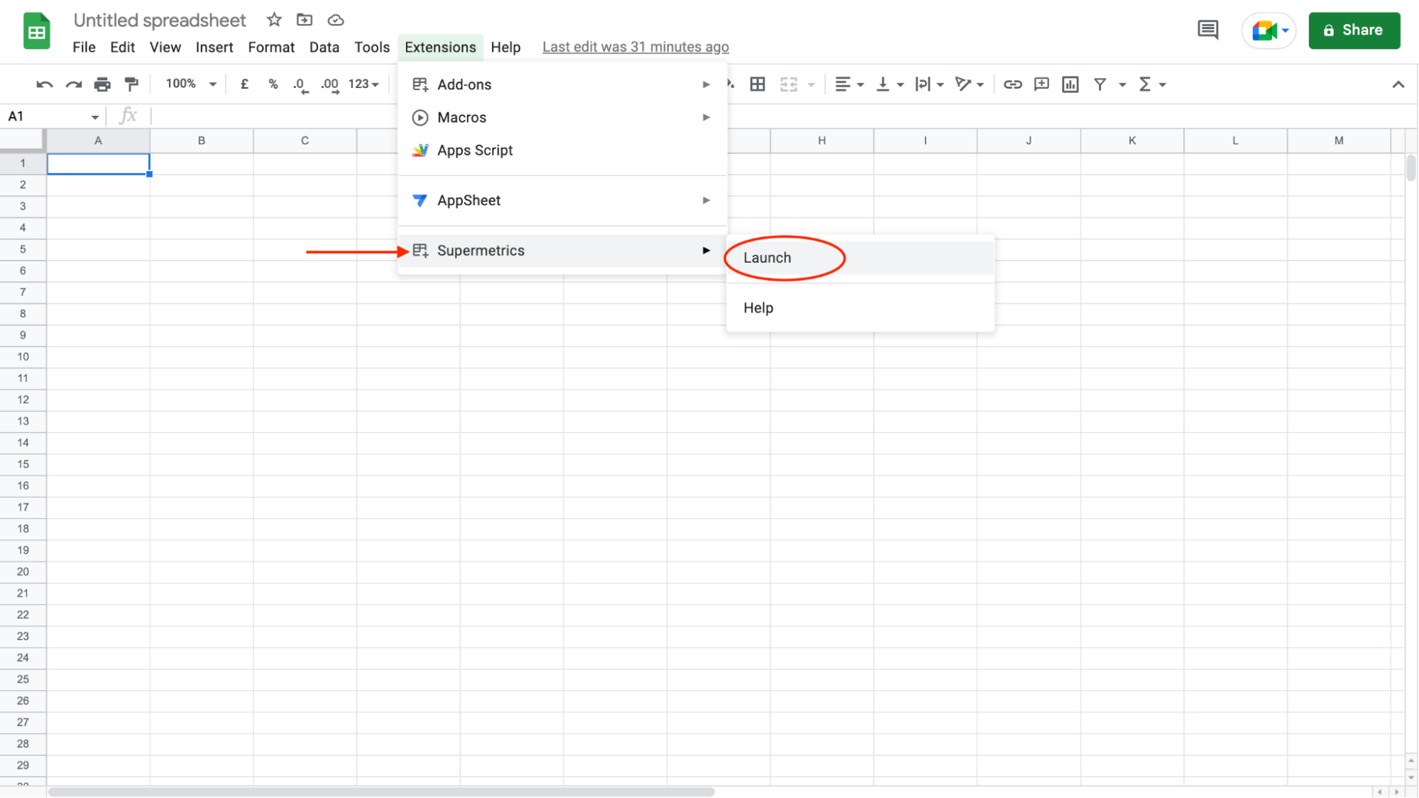 Launch the Supermetrics sidebar by clicking on “Extensions”> “Supermetrics”> “Launch.”