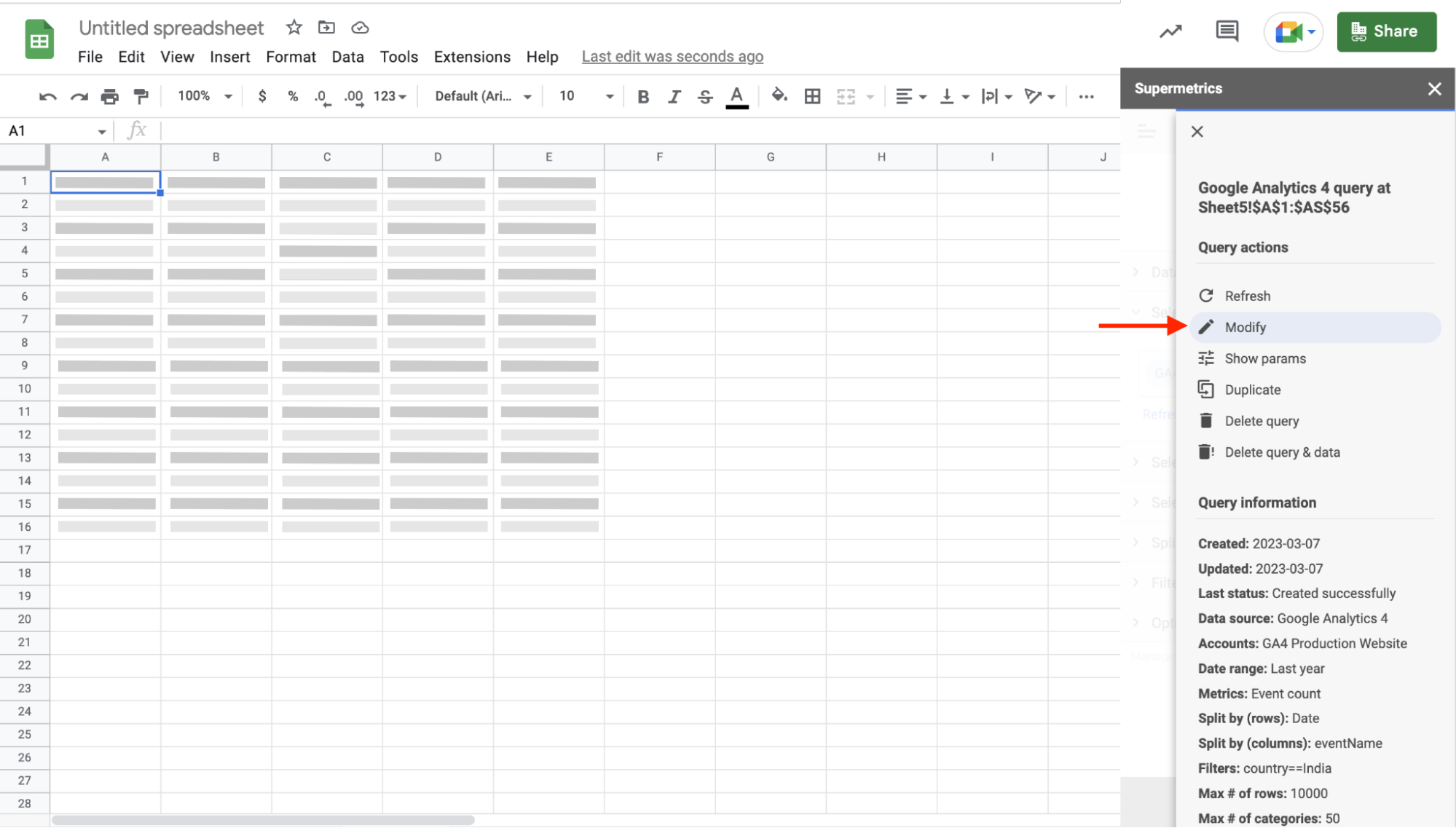 If you want to modify your query, simply click any cell that contains data from the query, and the sidebar will reopen. Then click “Modify” to make any changes you want.