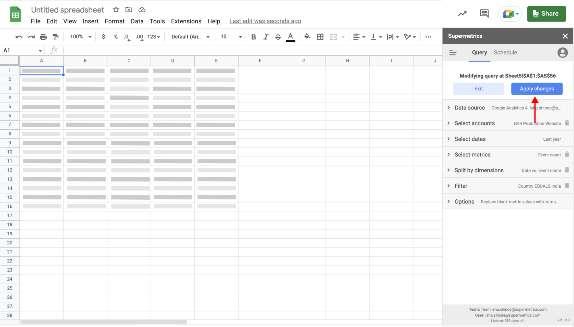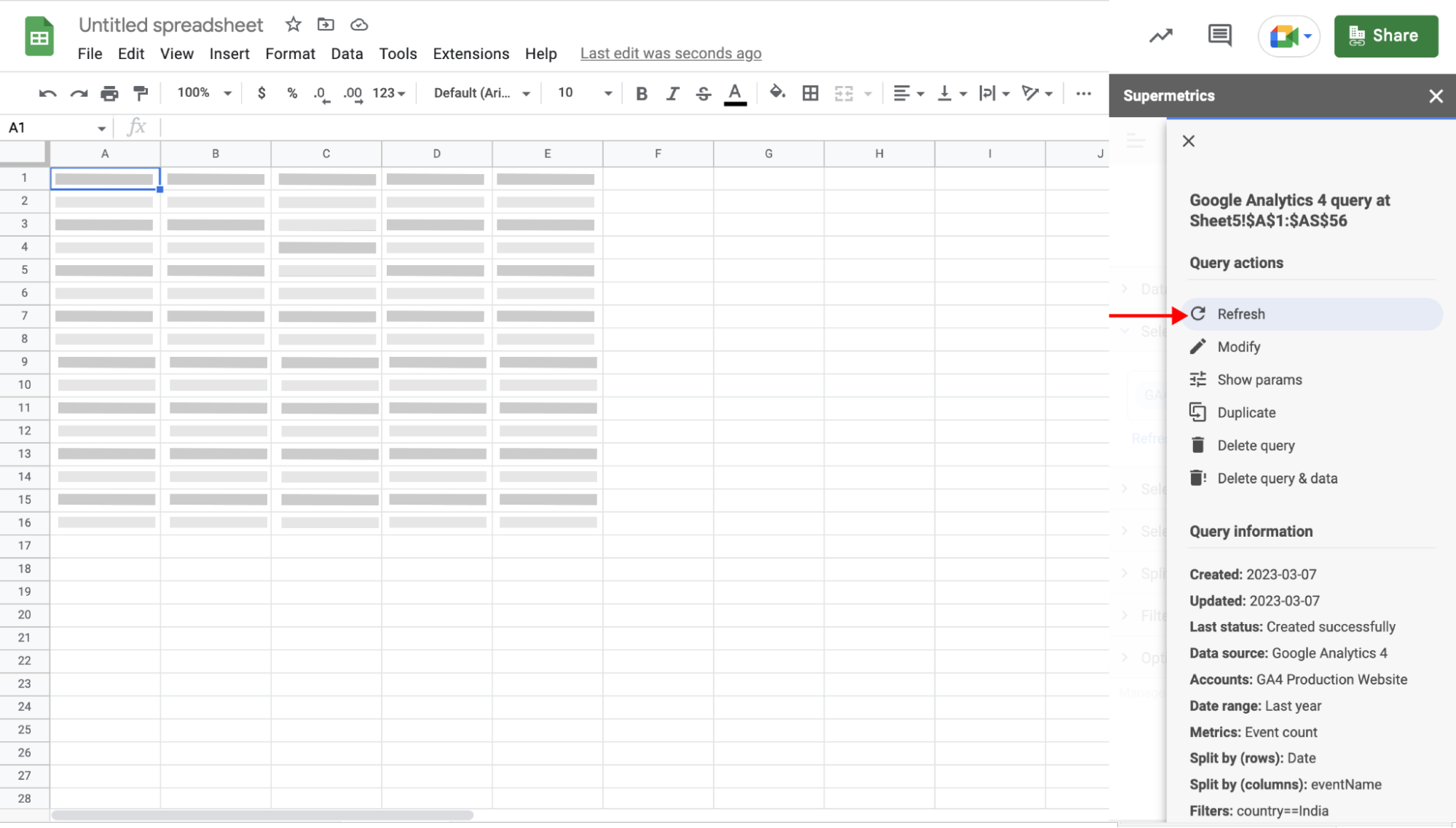 This will refresh all the queries in the spreadsheet. If you want to refresh the active sheet, click ‘Refresh active sheet’; if you want to refresh a single query, use the Supermetrics sidebar and click the ‘Refresh’ option.
