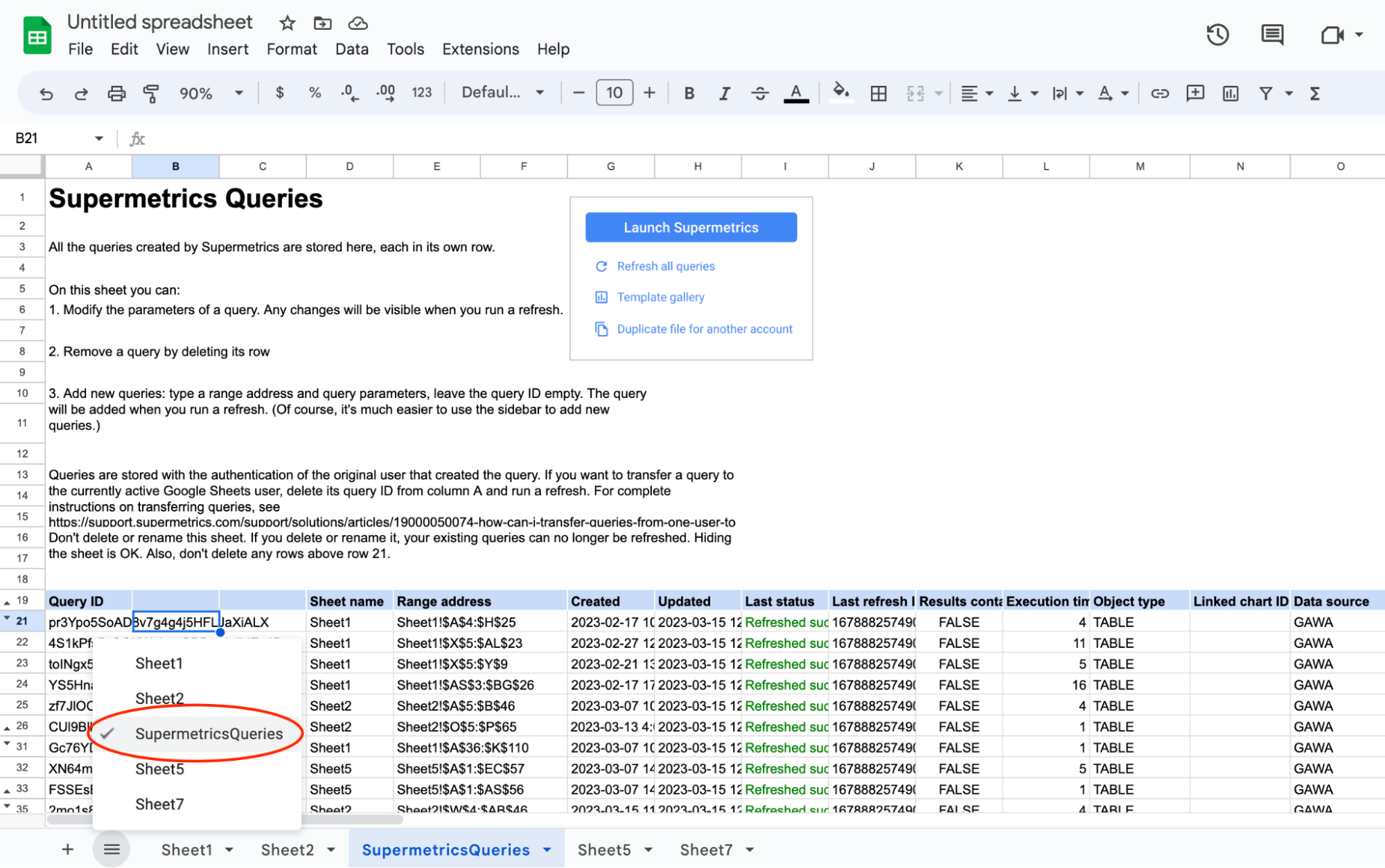 💡 Pro tip: If you cannot find the ‘SupermetricsQueries’ sheet from the bottom tabs, then it might be the case that the sheet is hidden. Follow the screenshot above and click the hamburger button and click the ‘SupermetricsQueries’ — this will unhide the sheet.