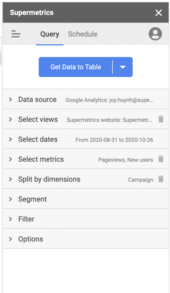 If you want to analyze the same data points daily, weekly, or monthly, you can use Supermetrics to automate new data transfers to your Google Sheets.