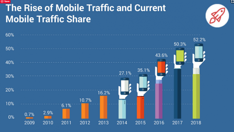 In 2017, mobile usage surpassed desktop for the first time. In 2018, 52.2% of all internet traffic occurred on mobile devices . Compare that with 2009, when less than a percentage of all internet traffic occurred on mobile devices.