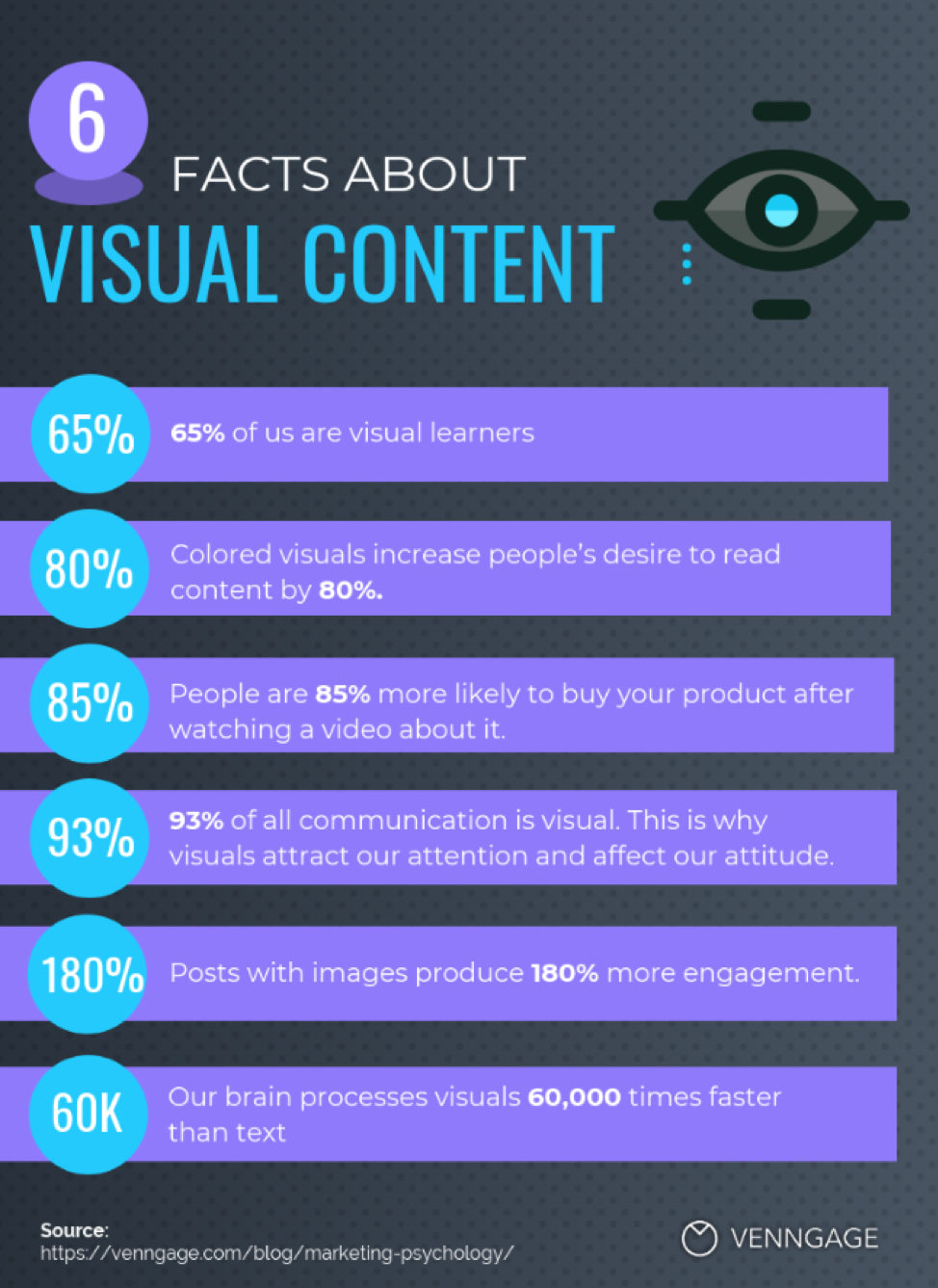 According to Venngage , people are 85% more likely to buy a product after watching a video and 80% more likely to read content that includes colorful visuals.