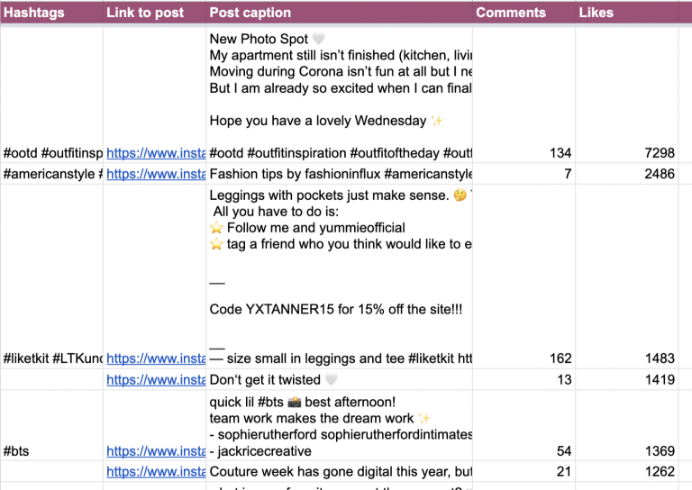 That’s because the list you’ll receive compiles all posts where the authors put hashtags in the captions or comments. Meanwhile, the “Hashtags” column shows hashtags only included in the captions. The empty box simply means the hashtags were part of a comment.