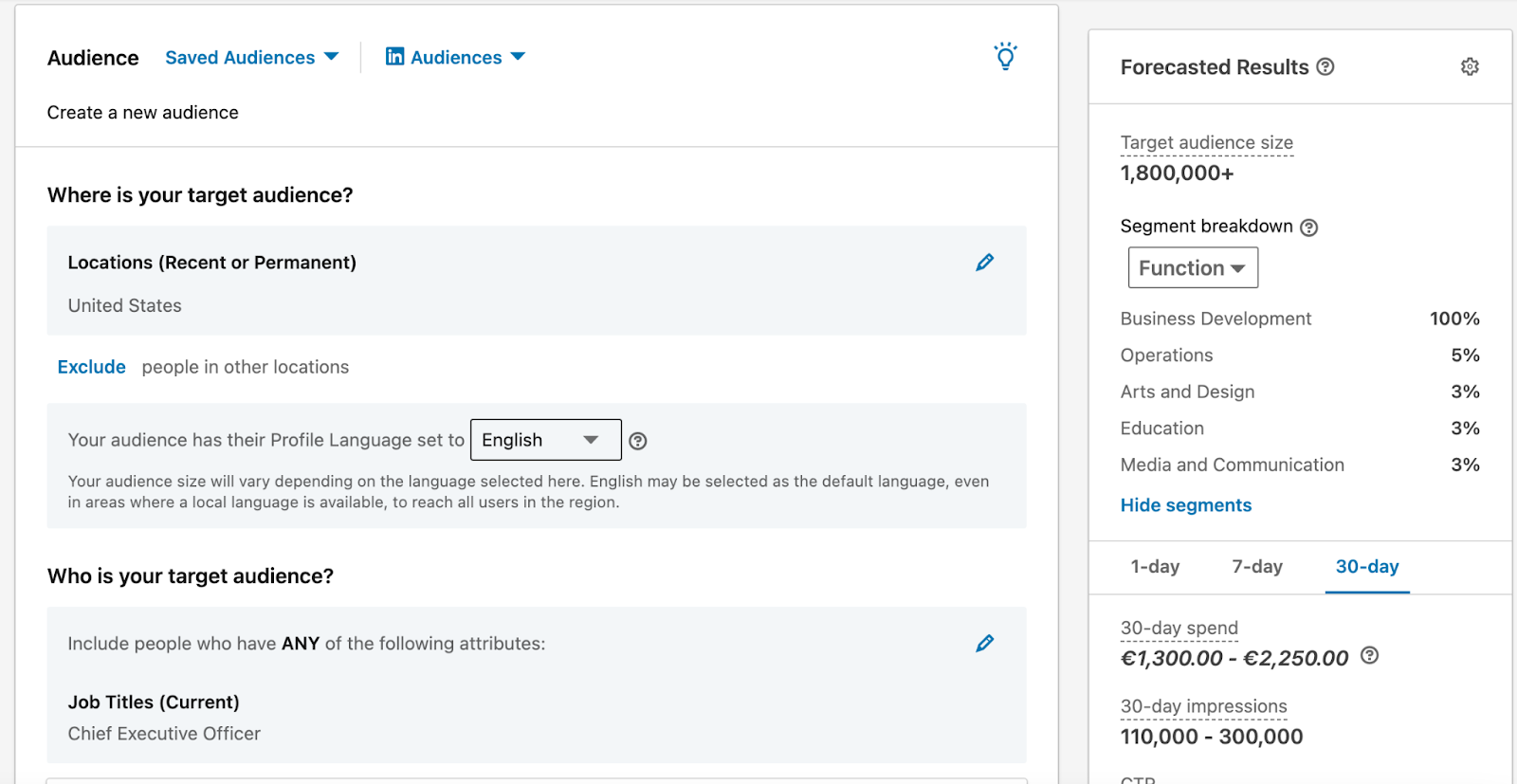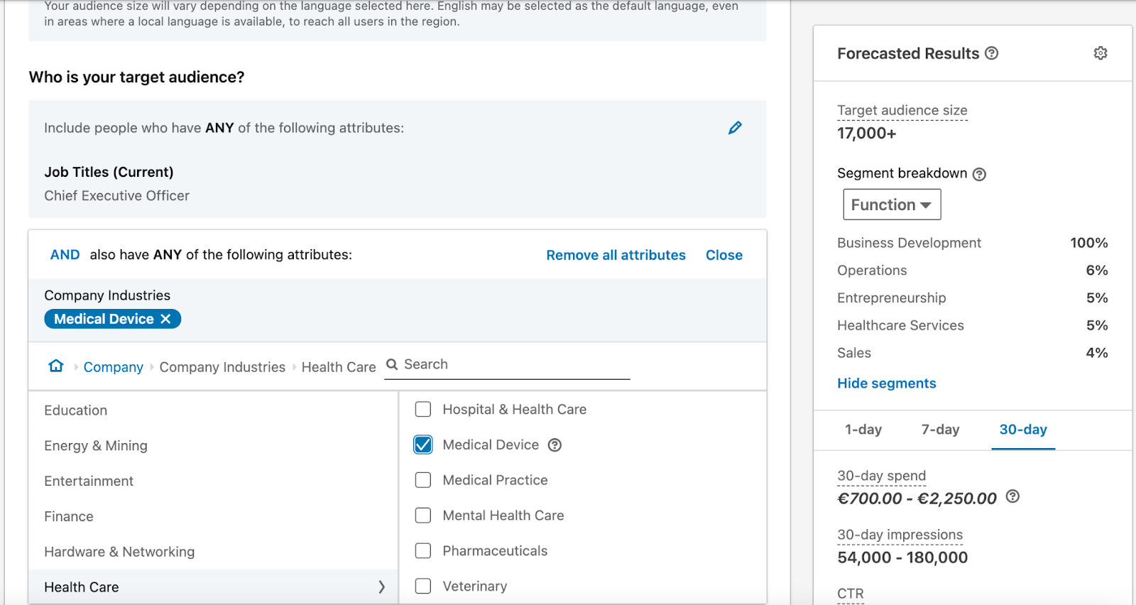 Usually, a good target audience size can be quite small, under 100,000 people, depending of course, on your objective and offer. But if you’re able to niche down your audience, you can also create a more relevant offer and get better results. If you target executives in the medical device industry, you only get 17,000 of them compared to advertising to every CEO in the United States which would be over a million. And your offering with a good message gets through even better.