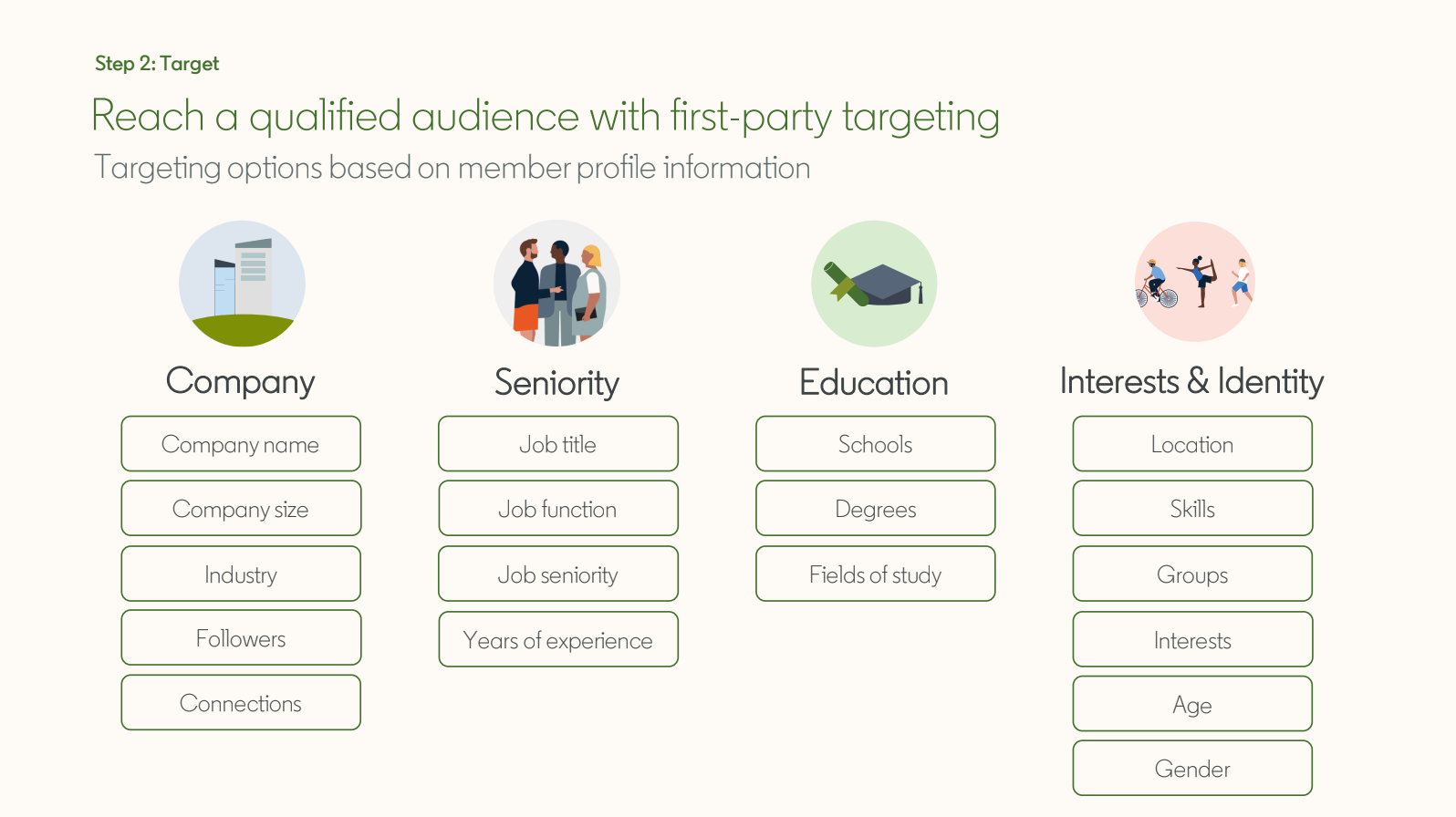 Running a B2B LinkedIn advertising campaign gives you access to powerful first-party data metrics. This allows you more targeting options to reach a more qualified audience based on user-provided information like job title, company size, and Interests and identity.