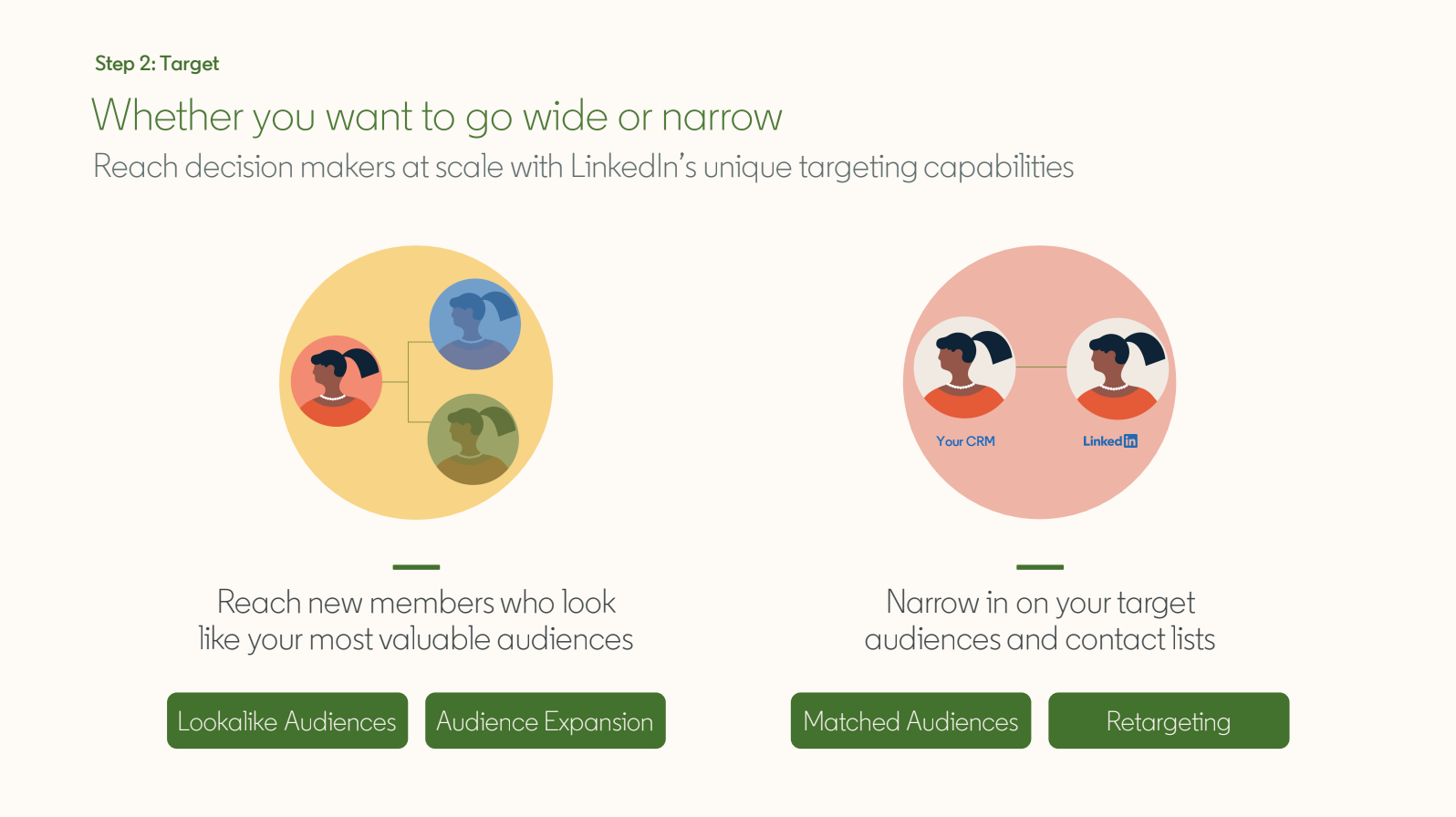 Matched audiences are generated based on the information you provide from contact lists or integrating the data from your CRM. This account-based marketing approach helps you to develop a more meaningful reach and even gives you the capacity to retarget customers who may have become disengaged.