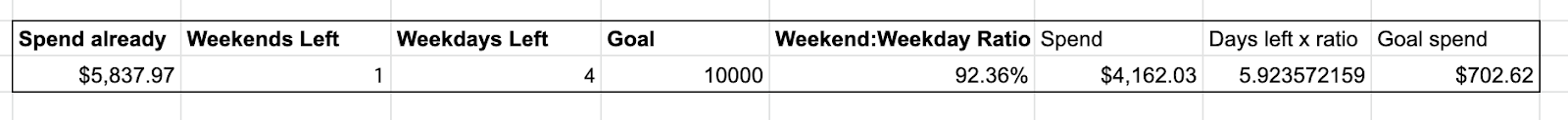 The goal spend is calculated with the following formula: spend / ((weekend/weekday ratio * the number of weekends left) + the number of weekdays left + 1).