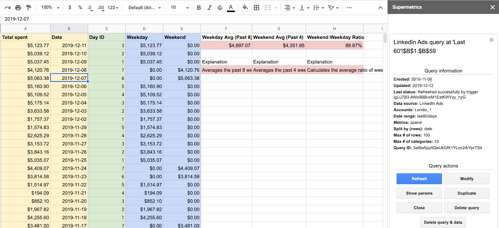 Weekday/weekend ratio is calculated from average spends on weekdays and weekends (i.e. average weekday spend/average weekend spend.). These calculations are based on your historical data. You’ll find them on the “Last 60” tab of this template.