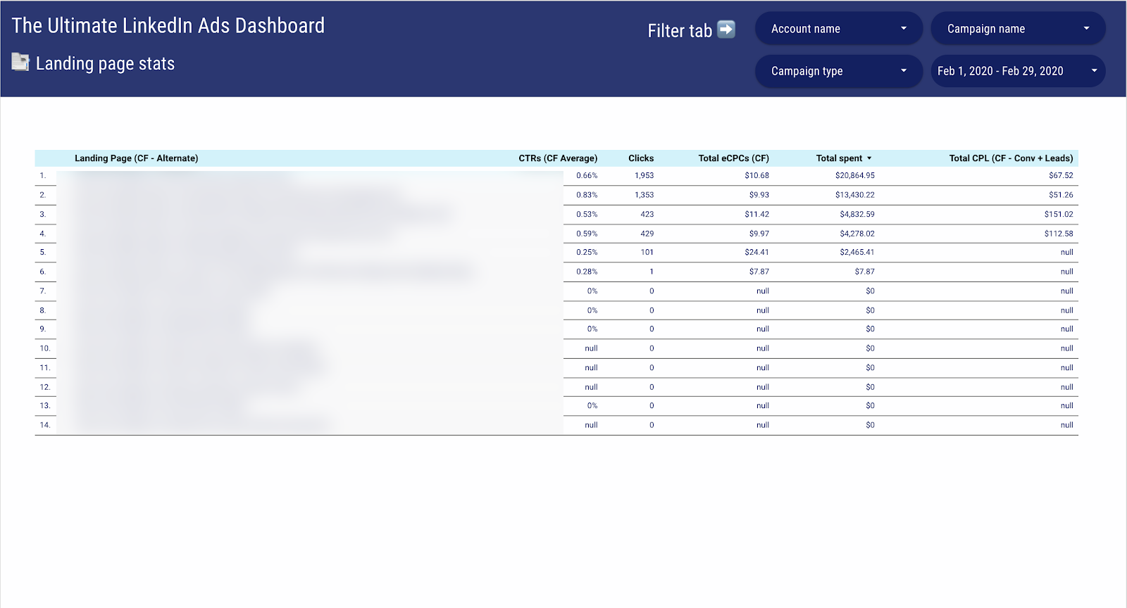 The first page provides a good overview of your key LinkedIn Ads performance metrics.