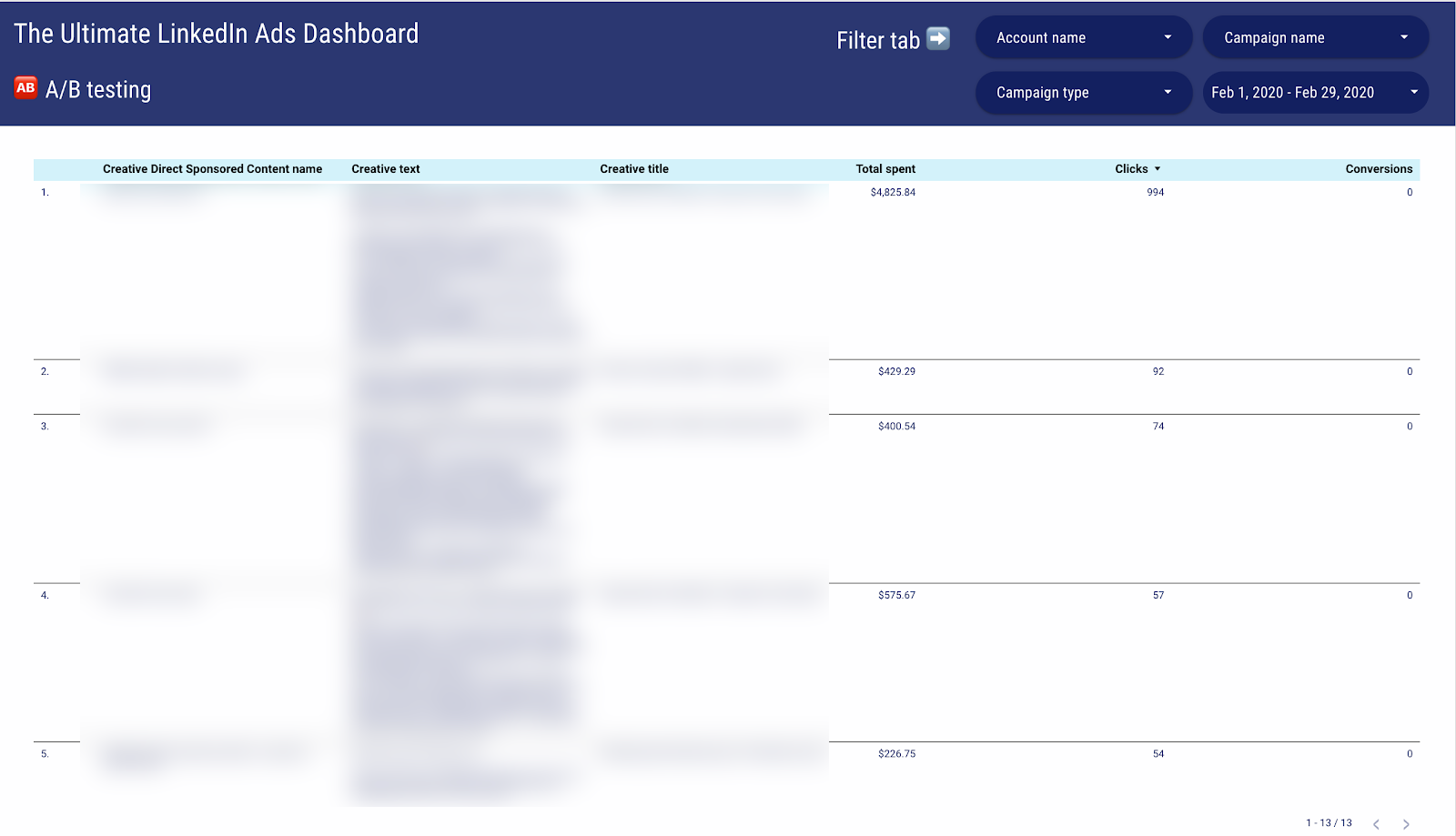 Page 3 shows how your campaigns are performing against the key KPIs. This view is almost the same as it would be in a LinkedIn Ads campaign manager with the difference that you can conveniently surface only the metrics you want to look at without having to switch between different tabs.