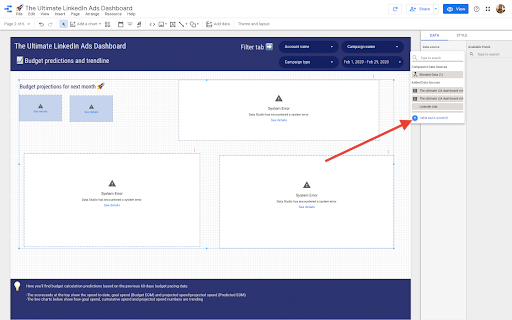 In order to connect the Google Sheet to Looker Studio, select all the empty graphs on the second page of the template titled “Budget predictions and trendline” and click “New data source” under the data sources tab.