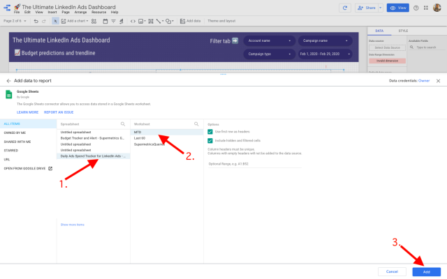 Next, select “Google Sheets” and add the first page of your Google Sheets LinkedIn Ads tracker template.