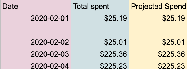 Projected spend is the number indicating how much you generally spend on weekdays and weekends, based on your past performance. This is how much you can expect to spend, assuming that your bids were not adjusted. Projected spend equals total (amount) spent for past dates. If a date is in the future, the formula will predict how much your account is likely to spend.