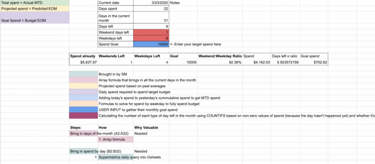 Now let’s dive in a bit deeper and look at how the goal spend numbers are calculated. The right side of this dashboard has the formula for automatically calculating the goal spend.