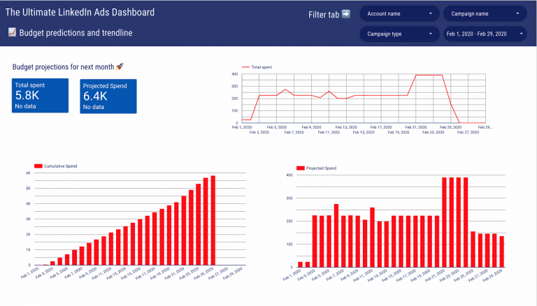 In addition to the Google Sheets budget tracker we have created a handy Looker Studio account overview dashboard that you can use with multiple LinkedIn Ads accounts. This dashboard will provide you with all the necessary graphs for tracking your LinkedIn Ads account and campaign performance.