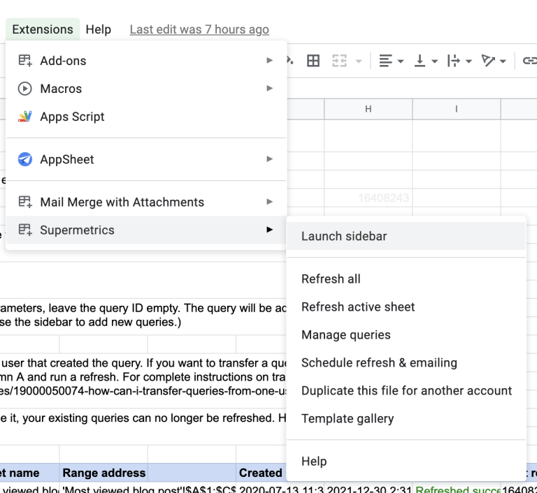 If you recently made changes to your campaigns, you can pull the last 14 days of data instead. To do this, open Supermetrics sidebar and put your cursor on one of the yellow cells at the top.