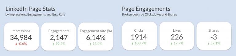 You’ll find scorecards showing the key LinkedIn page statistics such as impressions, engagements, and engagement rate. Additionally, you’ll also see how many times people clicked, liked, or shared your content.