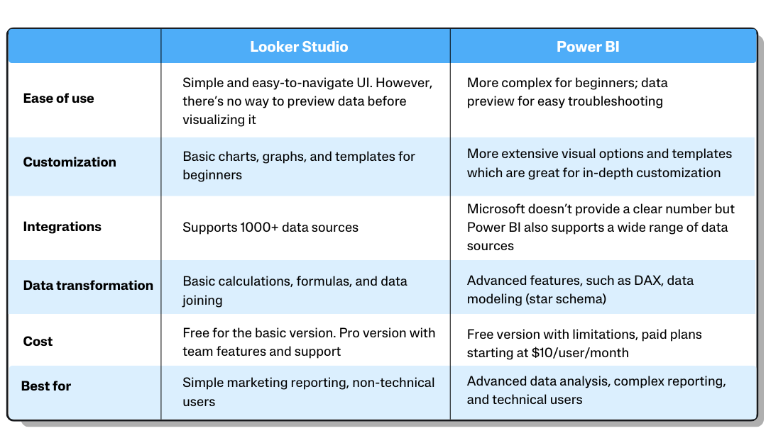 Looker Studio is the way to go if you mainly deal with simple and basic marketing reporting and you’re looking for an easy-to-use data visualization tool. On the other hand, if you’re a technical marketer who loves to dive deeper into data structures and modeling, Power BI is a better fit.