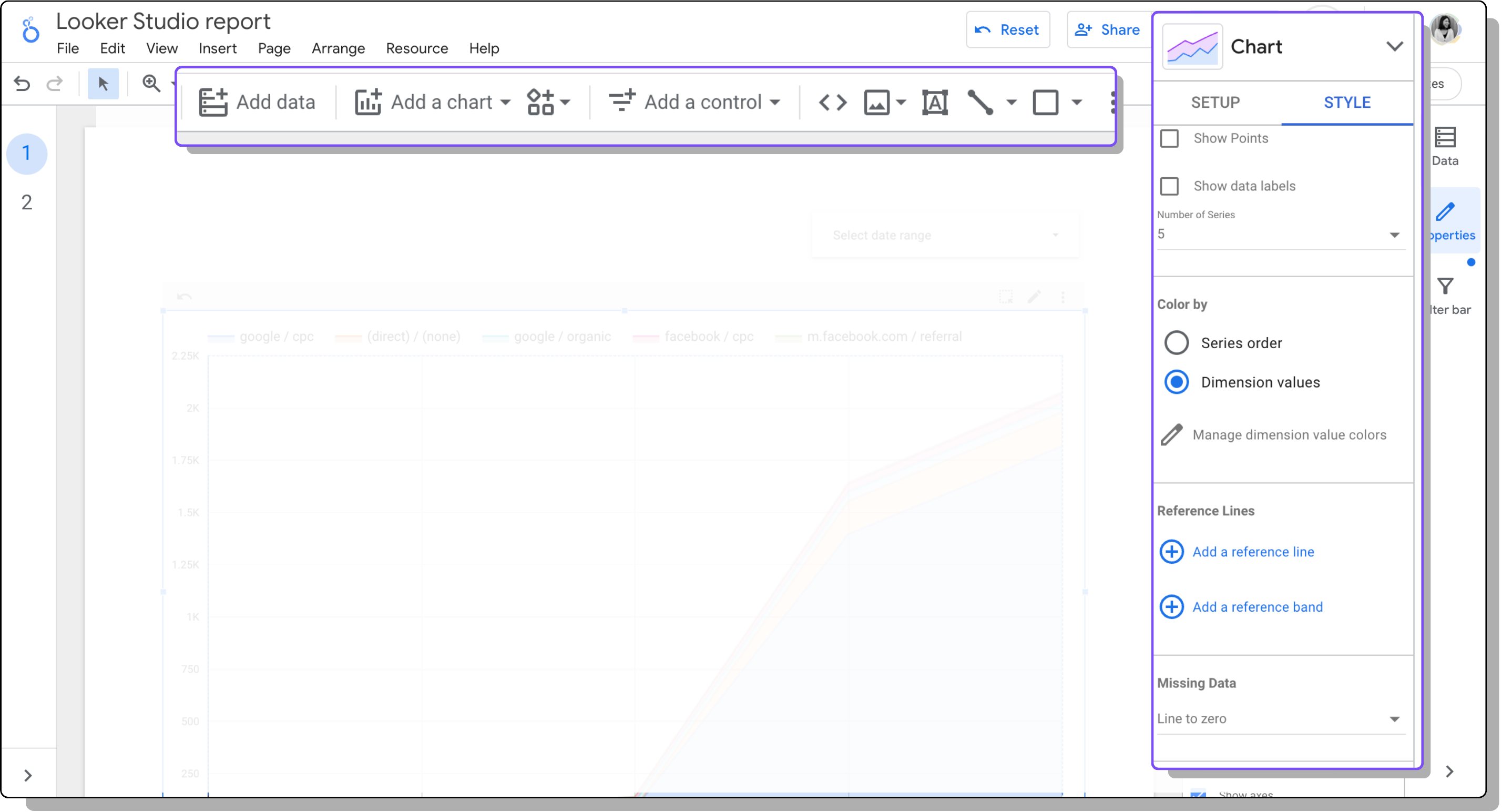 When customizing your reports, you’ll find many basic charts and graphs in your Looker Studio dashboard. You can also apply different themes and layouts to your dashboard to make them look on-brand.